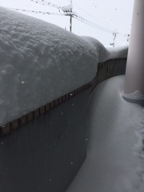 わが社のベランダも屋根があるのですが、雪が舞い込みモコモコ積もってます。