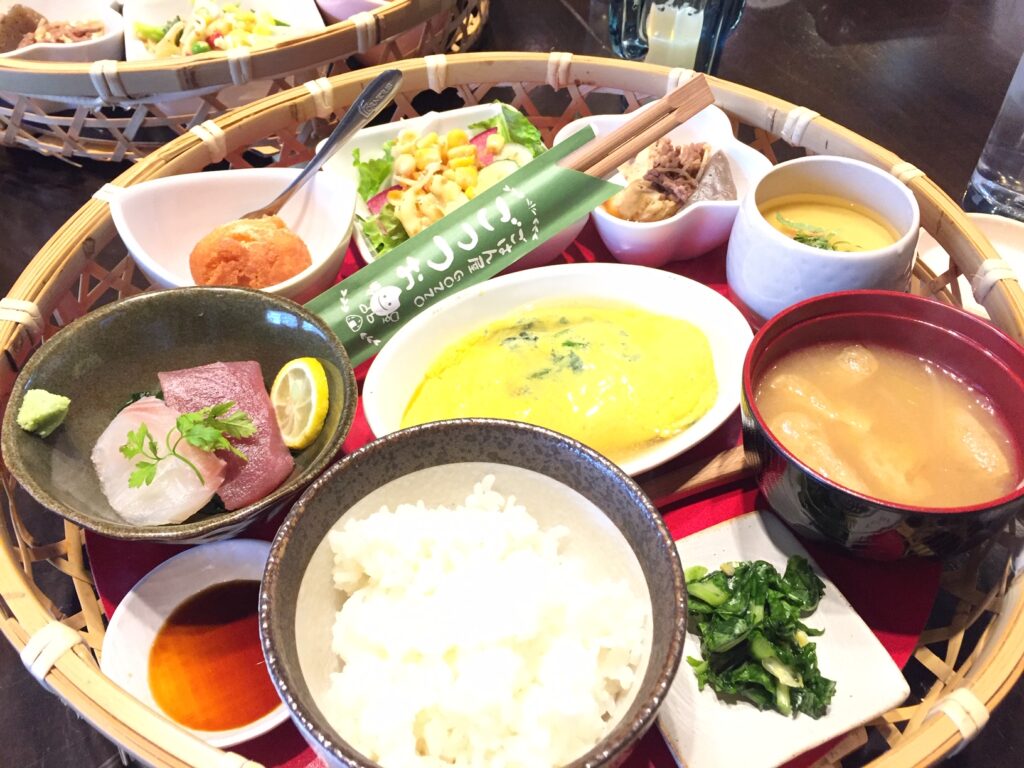 この日のランチは、オムライスにお刺身など、デザートにサーターアンダギーまでついてきて850円!