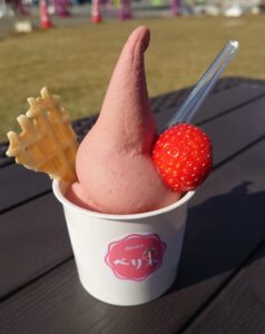 勝山産のいちご100%のソフトクリームは、甘さ控えめ、程よい酸味、